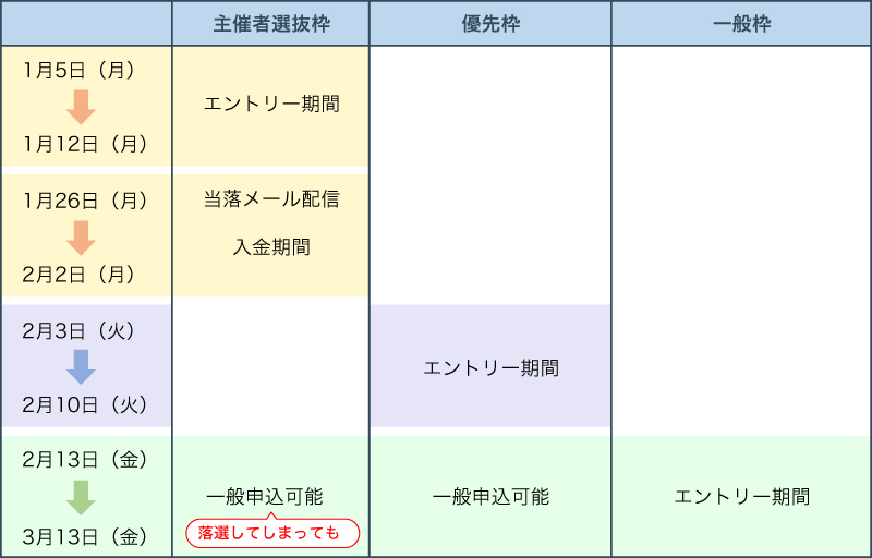 - 2月3日(火曜日)零時より、一般エントリーに先立ち、優先エントリーを開始いたします。対象者は以下に該当する方になります。